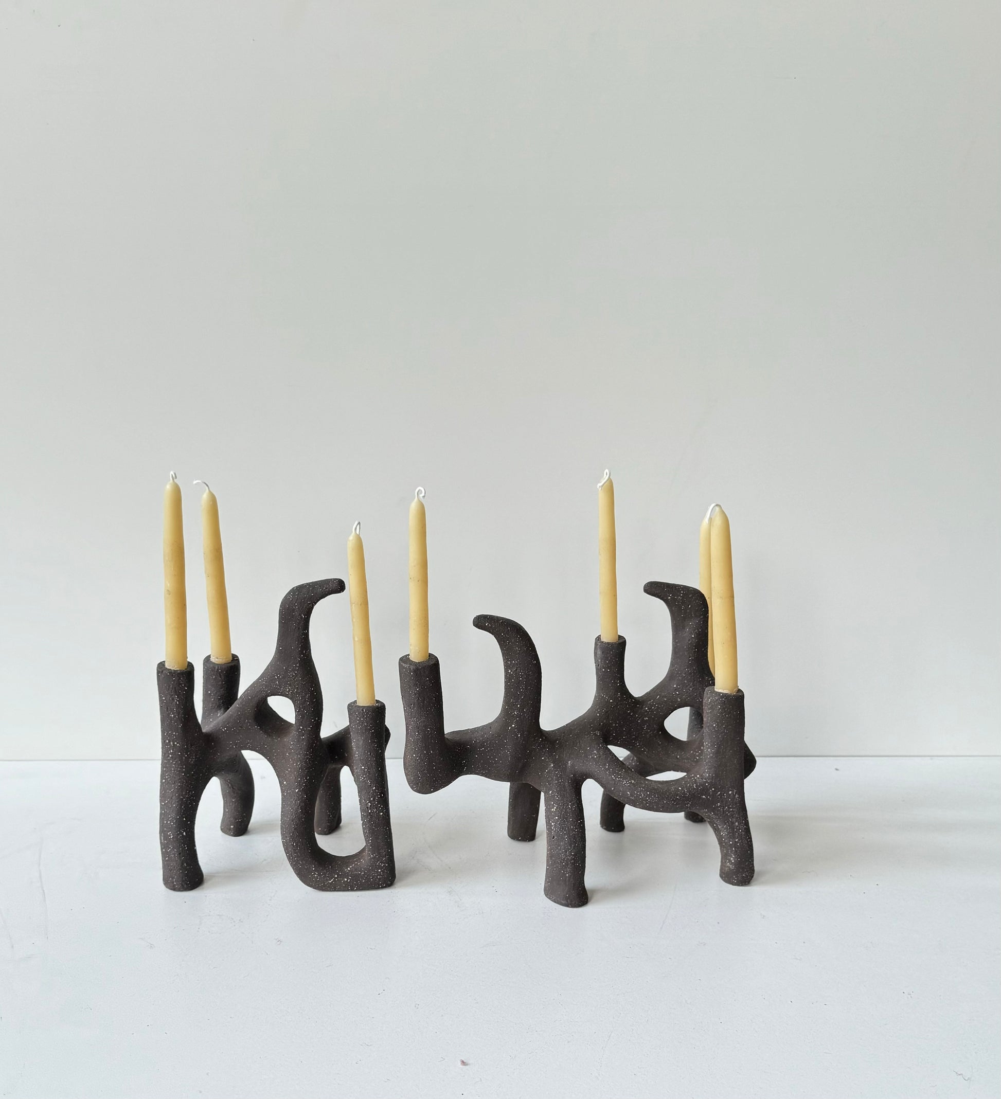 Handmade entirely using the coil technique. Each piece is one of a kind and is filled with love, time and effort. We consider this 2 piece black 7-tier candelabra to be a conversation piece and will create a sense of excitement in any space of your home.