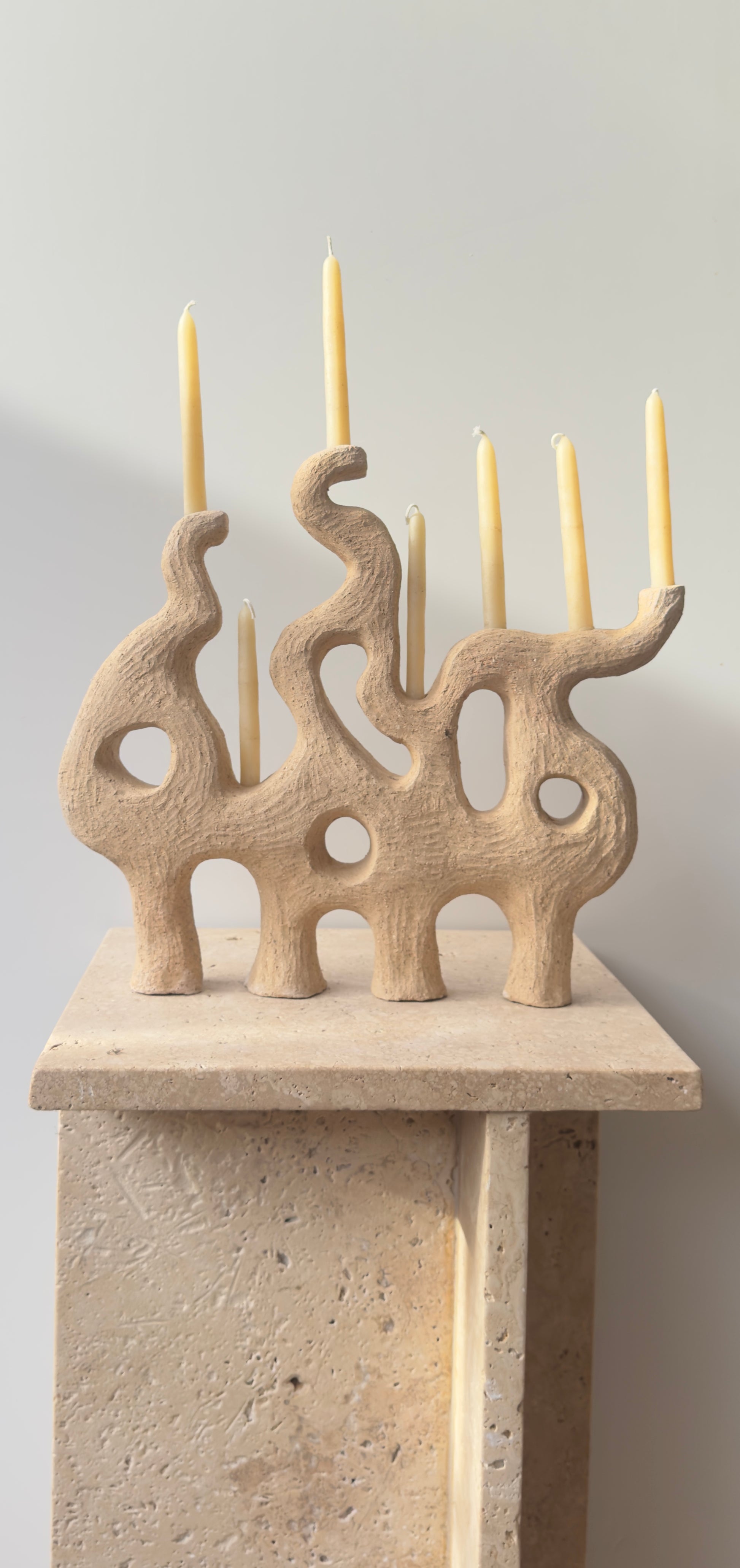 Hand-built sandstone toned clay, this sculptural candelabra features flowing curves and carved openings that evoke natural erosion and movement. Its tactile texture and arched legs bring a grounded, earthy presence, while candlelight transforms it into a warm and expressive centerpiece.
